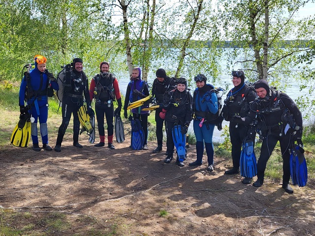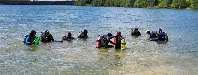 Zunächst bekamen wir eine kurze Einweisung unserer Tauchlehrer, was uns die nächsten Tage alles so erwartet. Dann ging es auch schon los. Rein in die Tauchklamotten und auf zum ersten Tauchgang. Wenn ich von mir spreche, kann ich sagen, dass ich schon etwas nervös und ängstlich war. Durch gutes Zureden und viel Verständnis der Tauchlehrer legte sich dies aber schnell. Die Gruppen wurden aufgeteilt und dann ging es rein in den 13 Grad warmen bzw. kalten See. Beim ersten Tauchgang sollten wir noch keine Prüfungen machen und uns erstmal an alles gewöhnen. Als nach ca. 15 Minuten alle wieder an der Wasseroberfläche „aufpoppten“, hatte jeder auf seine Weise einen ersten Eindruck vom Tauchen in einem See. Um sich das mühevolle An- und Ablegen der Tauchausrüstung zu ersparen, beschlossen unsere Tauchlehrer den zweiten Tauchgang – ohne den See zu verlassen – gleich im Anschluss durchzuführen. Nun versuchten wir, besseres Tarieren zu üben. Dazu konnten im See angebrachte Übungsringe genutzt werden. Vor dem dritten Tauchgang sollten wir alle erstmal Pause machen. Also raus aus dem Wasser zurück zu unserem Tauchlager. Tauchausrüstung ablegen – trockene Sachen anziehen - essen u. trinken und dann ausruhen. Nach einer längeren Pause hieß es dann wieder „Also quetscht euch nochmal rein in eure Tauchsachen“. Beim dritten Tauchgang wollten wir etwas tiefer tauchen als bei den ersten Tauchgängen, außerdem wurden bei diesem Tauchgang alle Unterwasserzeichen abgefragt, die ein Taucher können muss. Auch meine Lieblingsdisziplin „Maske ausblasen“ wurde nochmals wiederholt. Das war Tag eins unserer Freiwassertauchgänge und jeder ging zufrieden aber auch erschöpft nach Hause.