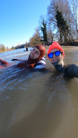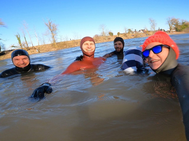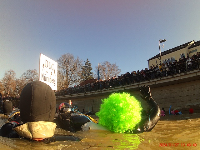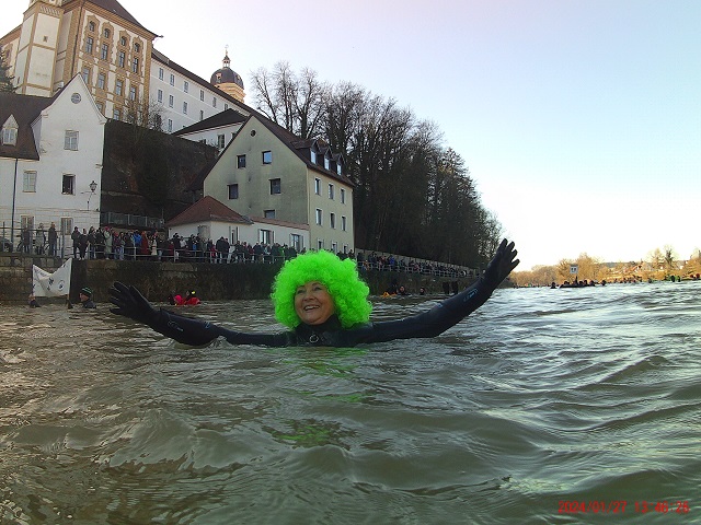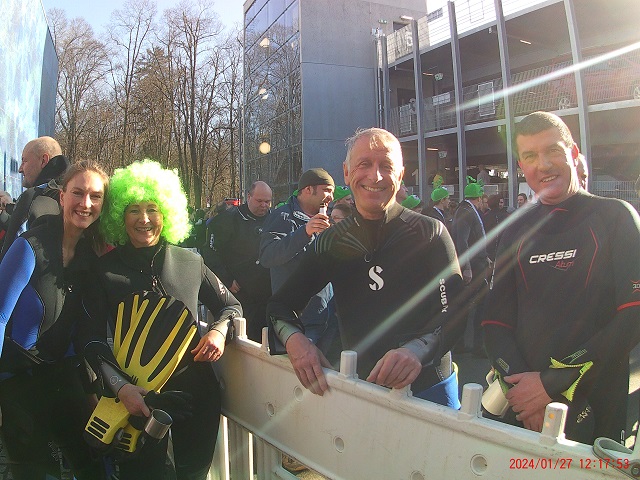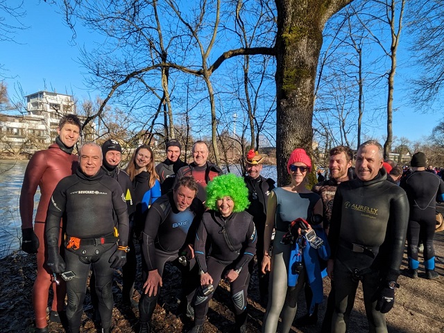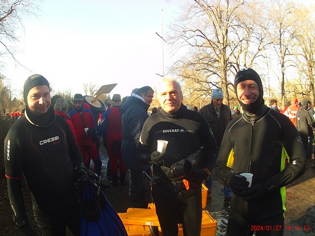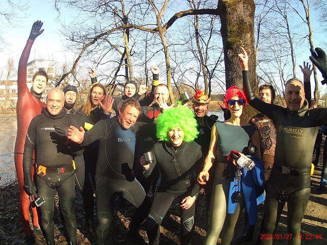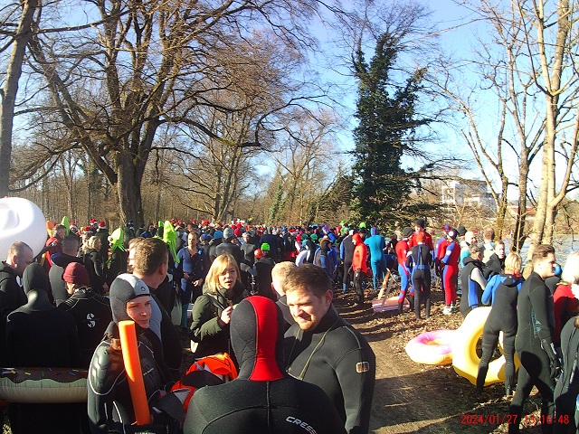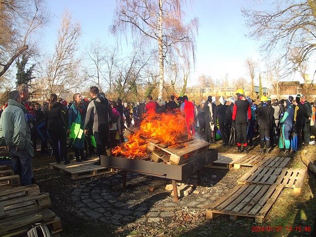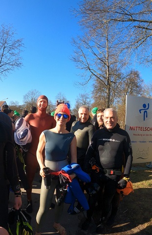 Das Schwimmen ging heuer zügig von statten. Keine Zeit, um kalte Finger und Füße zu bekommen. Egal ob im Trocki, dickem Taucherneopren oder Apnoe-Anzug. 10 Minuten Schwimmzeit meinte die Presse. Helfende Hände griffen wo nötig zu, um uns alle wieder sicher an Land zu bringen. Die heiße Suppe stand genauso bereit, wie die Feuerwehr, die jeden grob vorreinigte, bevor es wieder ins Schwimmbad ging. Duschen, enges Kuscheln im wohl temperierten Schwimmbecken inklusive. Der Ausklang fand mit Essen, Getränken und Rahmenprogramm in der großen Festhalle statt. Die Großgeräte waren auf dem Parkplatz ausgestellt und wurden wie in jedem Jahr prämiert. Nur für den Festball hatten wir auch diesmal keine Karten.